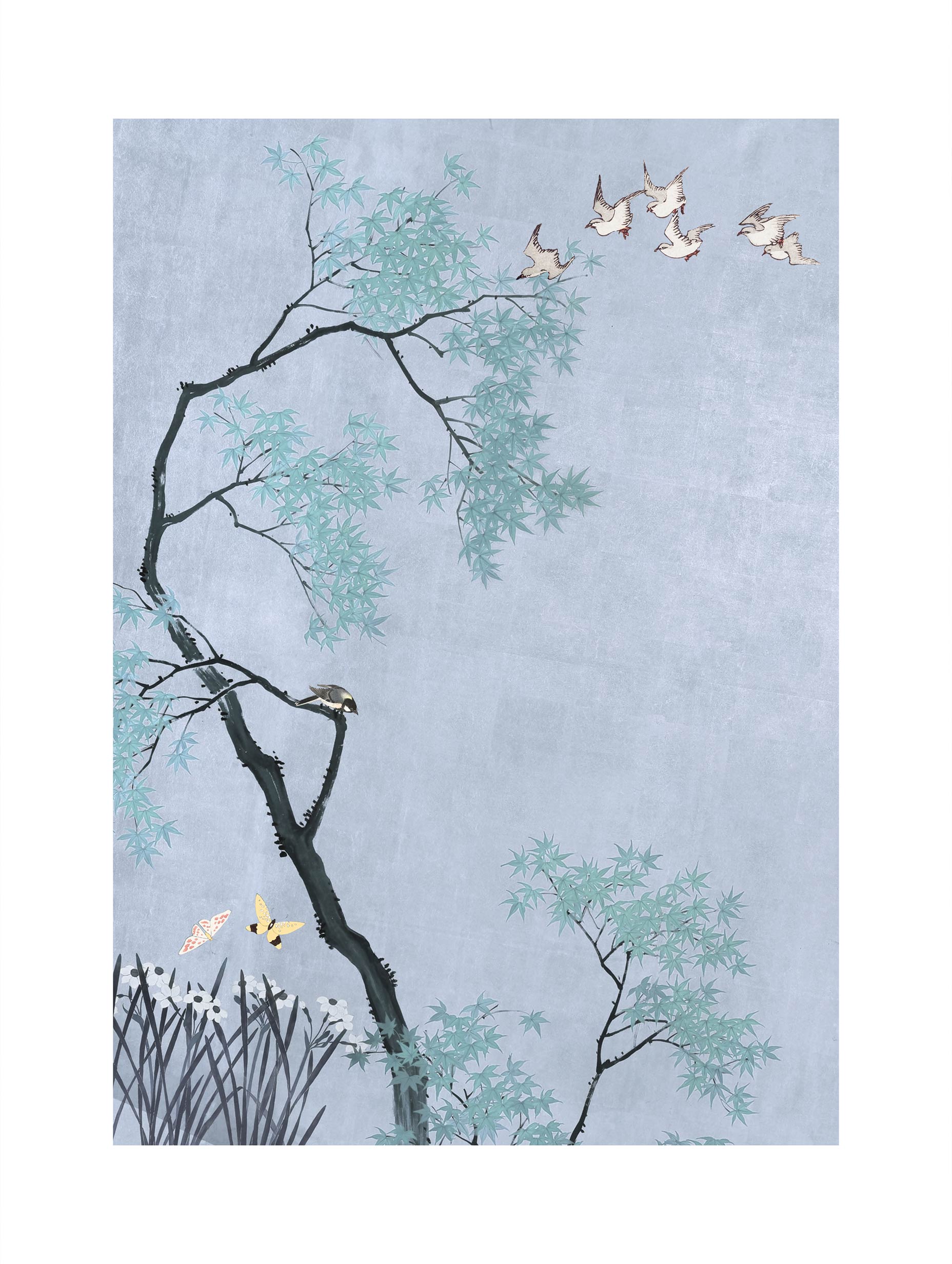 A calm remix and airy art print featuring delicate birds on a branch of blue maple leaves. The soft colors and simple composition give the poster a peaceful, Japanese-inspired feel. A timeless print that adds a light and elegant touch to your wall. Perfect for Japandi, minimalist, or Scandinavian interiors.