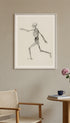 Kunsttrykk med et detaljert skjelett fanget i bevegelse. De myke tonene og den rene bakgrunnen gir kunstverket et rolig og moderne utseende, samtidig som det fremhever menneskekroppens struktur.