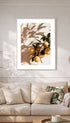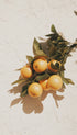 Stillebentrykk av sitroner som henger fra en løvrik gren i varmt naturlig lys. Myke skygger og dempede toner gir det et rolig, solfylt utseende med et middelhavspreg. Et friskt og enkelt møbel som passer perfekt inn på kjøkken, spisestue eller lyse, moderne rom.