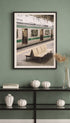 Plakat med en stille jernbaneplattform og et pendlertog i ro. Rene linjer, diskré kornstruktur og milde farger skaper en rolig, litt nostalgisk følelse. Den grønne stripen gir en myk kontrast til den nøytrale omgivelsen. Et minimalistisk trykk som gir et fredelig, urbant preg til rommet ditt.