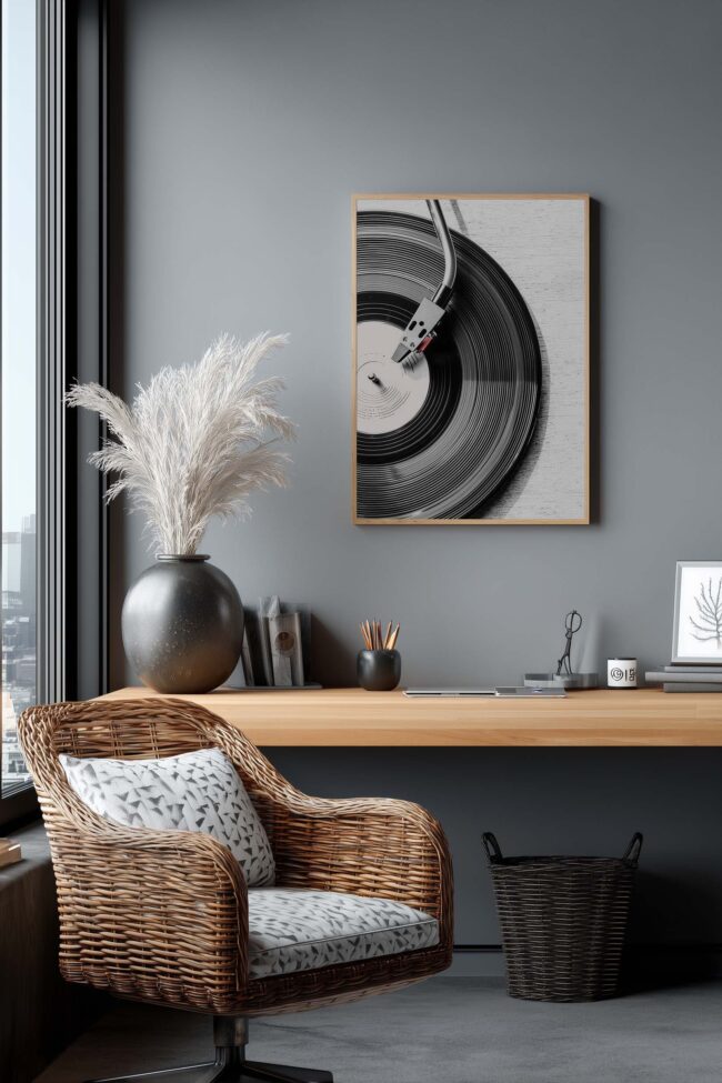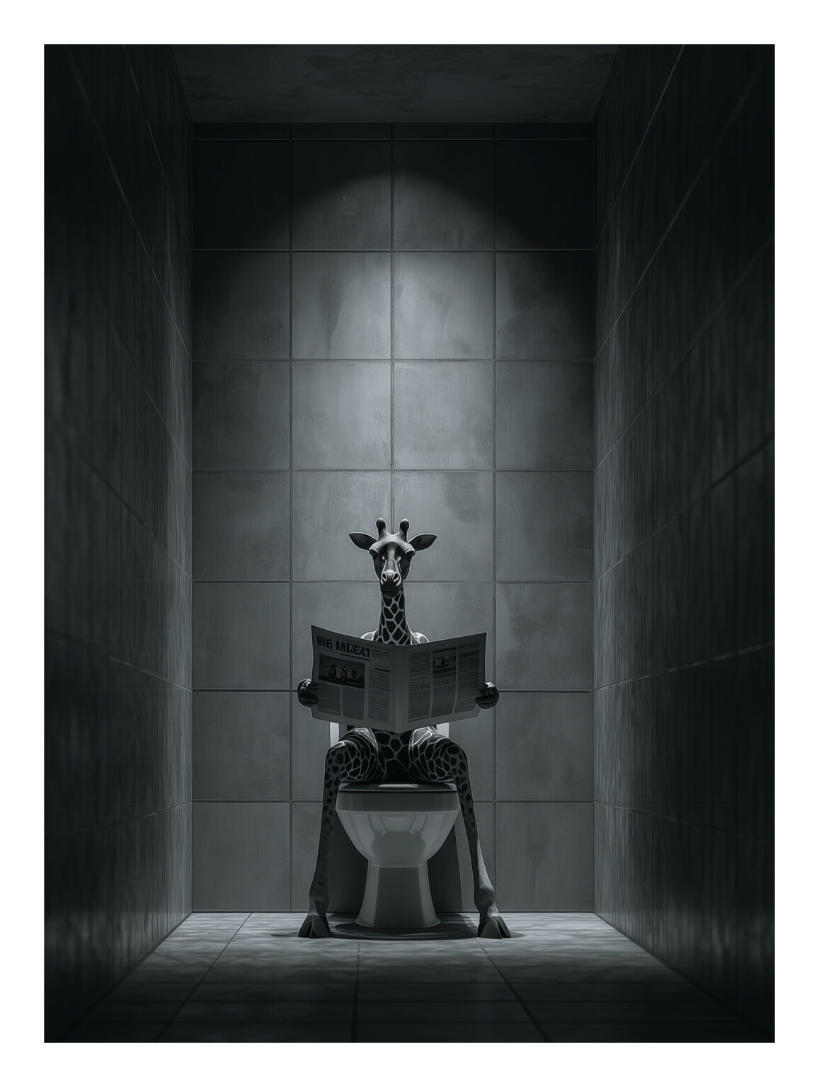 Giraffe reading in a tiled bathroomA hyper-realistic black-and-white print of a giraffe calmly sitting on a toilet and reading a newspaper under moody overhead light in a minimalist gray‑tiled space. The surreal scene blends deadpan humor with cinematic precision, creating a quirky focal point that sparks conversation.A bold statement piece that adds unexpected wit to modern bathrooms, hallways, or creative studios.