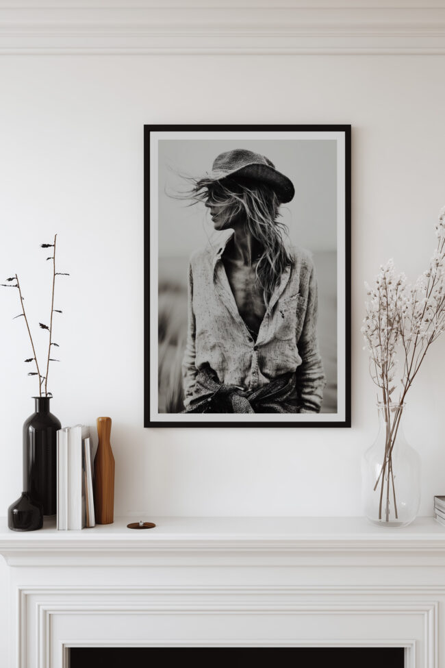 Poster of a Young WomanThis Modern art print shows a young lady in a sleek black‑and‑white portrait. She has smooth platinum‑blonde hair and stands in front of a bold, geometric design. The image feels both modern and classic, just like a high‑fashion magazine cover from the past. Simple lines and strong contrast make the poster stand out, adding a touch of refined beauty to any room.Perfect for modern, minimalist, or fashion-forward interiors, this artwork adds a refined, cosmopolitan flair to any room décor.