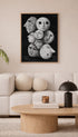 A surreal composition with overlapping faces in different expressions. Some calm, some sorrowful, some mask-like with hollow eyes. The textured surfaces resemble the craters of the moon, giving the artwork a dreamlike and celestial feeling. The monochrome tones highlight themes of identity, hidden emotions and multiplicity. Perfect poster for collectors drawn to psychological, surreal and thought-provoking, this print makes a striking statement in modern interiors, especially when paired with minimal or moody décor.