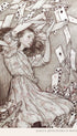 Vintage storybook poster of Alice surrounded by falling playing cards.