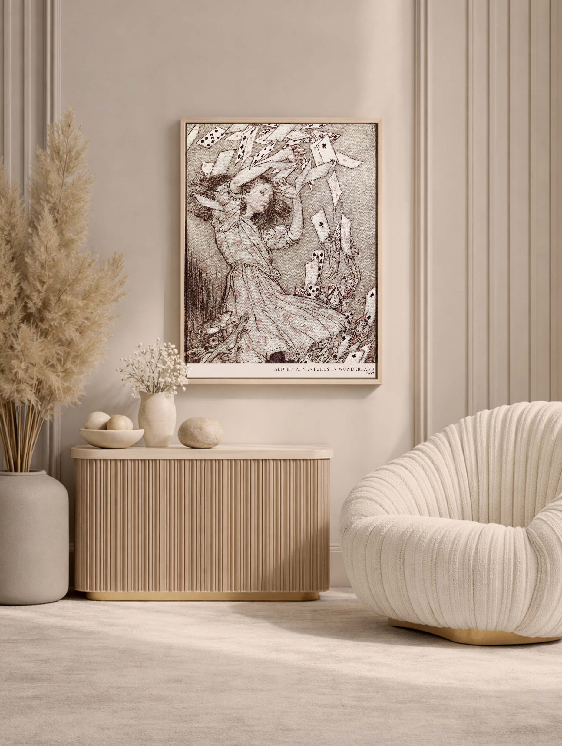 This art print features an illustration from the 1907 edition of Alice’s Adventures in Wonderland, created by Arthur Rackham in his delicate and dreamlike style. Soft sepia tones, fine line-work, and the swirling cascade of playing cards give the scene a whimsical, slightly mysterious mood full of storybook charm. Timeless and imaginative, this vintage illustration poster adds character, elegance, and a literary touch to your wall decor. Perfect for eclectic, classic, whimsical, and vintage-inspired interiors.