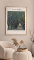 This poster features Gustav Klimt’s Avenue in the Park of Schloss Kammer, a striking landscape where twisting tree trunks and dense green foliage form a dramatic natural corridor. The layered brushwork and cool palette of green, blue, and violet give the scene a vibrant, immersive character, while the path and distant building create balance and calm. A timeless print that brings depth, texture, and an elegant natural mood to the wall.