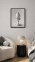 A minimalist still-life featuring a sculptural egg balanced on a classic pedestal. Clean tones and soft lighting create a simple yet playful design, perfect for modern and Scandinavian interiors.