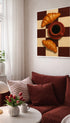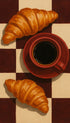 Cozy café-style print with a red coffee cup and two croissants on a cream-and-burgundy checkered table. The warm colours and soft brushstrokes create a calm morning feel. A perfect piece to bring a touch of French café charm to your kitchen or coffee corner.