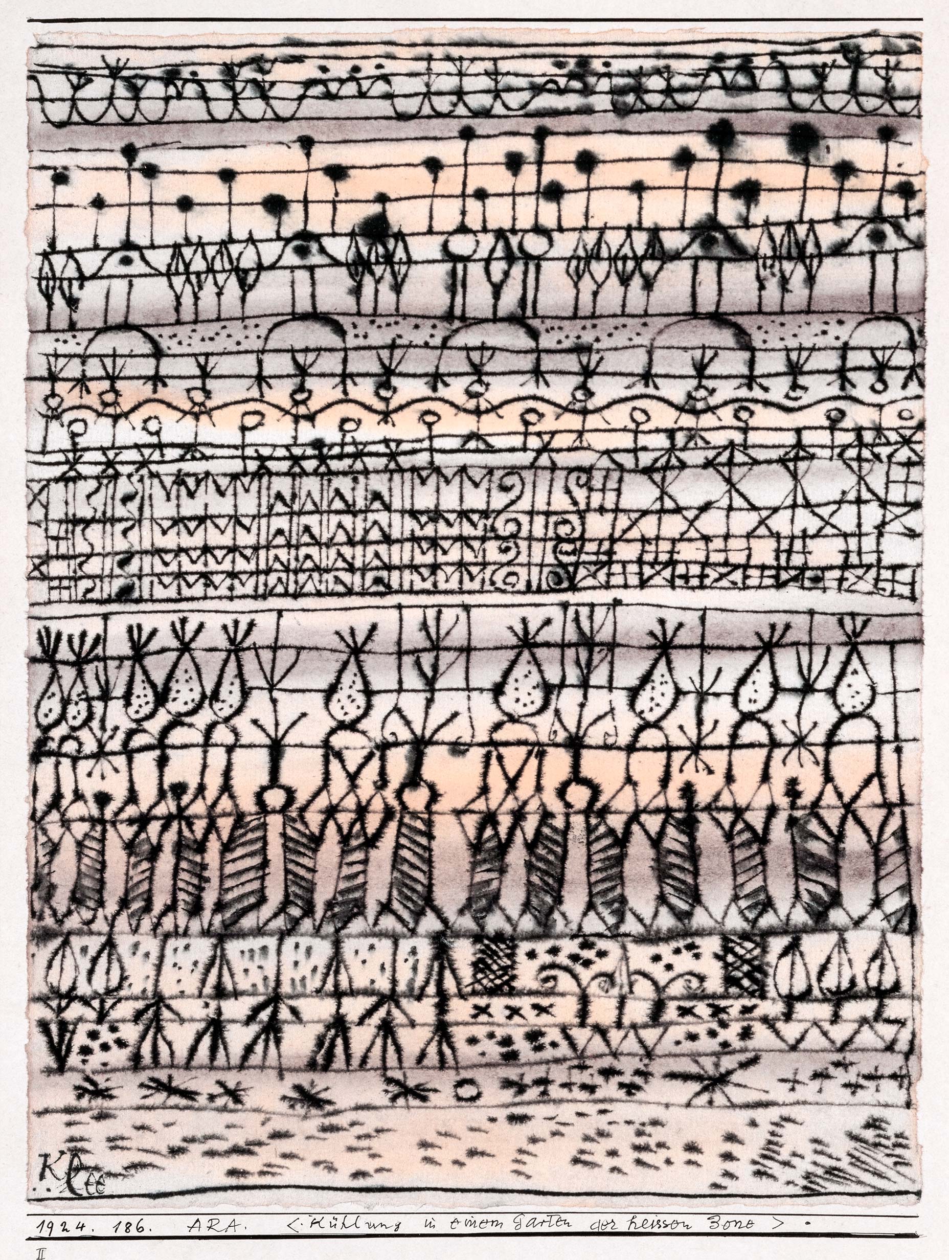 This art print reproduces Cooling in a Garden of the Torrid Zone (Kühlung in einem Garten der heißen Zone) created by Swiss-German artist Paul Klee in 1924. The composition unfolds in horizontal bands filled with playful symbols, delicate lines, and abstract figures that resemble plants, people, and ornamental patterns. Klee’s distinctive style blends spontaneity with structure, creating a visual rhythm that feels both imaginative and musical. A fascinating modernist poster that adds creativity, character, and artistic depth to your wall decor.