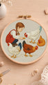 Warm thread shading and neat outline stitches capture a sweet farm moment - soft fill-stitches shape the little girl’s face and clothes, while textured feather stitches bring the chickens to life on artisanal hand-woven cotton.