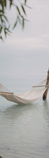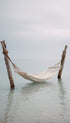 Graphical print with a soft fabric hammock drifting above silvery coastal waters. The poster features a muted grey sky and warm beige undertones for a clean, Scandinavian‑inspired look. Ideal print for creating a tranquil, airy atmosphere in your living space. A perfect match for coastal, Japandi, or Scandinavian interiors.