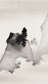 Japanese ink-wash poster of misty mountains with a lone pine silhouette.