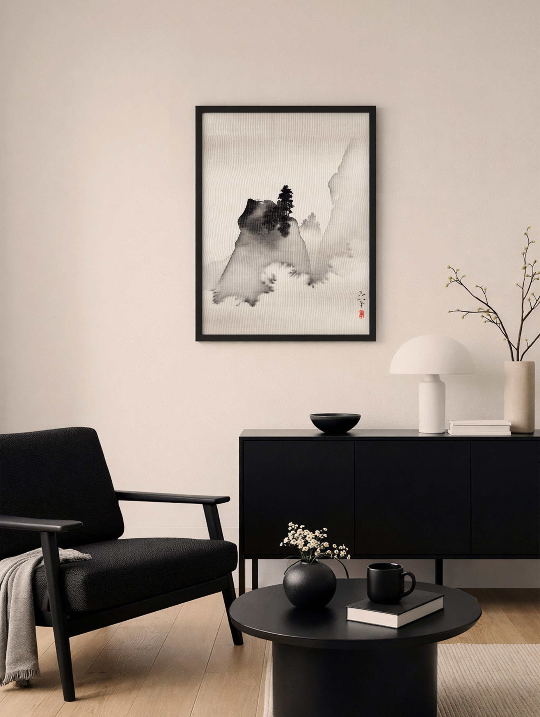 This art print features Mountains by Suzuki Kiitsu, the center panel of the triptych Three Evening Scenes created in the first half of the 19th century. Soft ink washes dissolve into fog and open space, while the dark pine crown anchors the composition with quiet strength. Minimal, meditative, and timeless, this Japanese wall art brings calm, balance, and a gallery-like stillness to your wall decor. Perfect for Japandi, Scandinavian, and minimalist interiors.