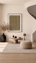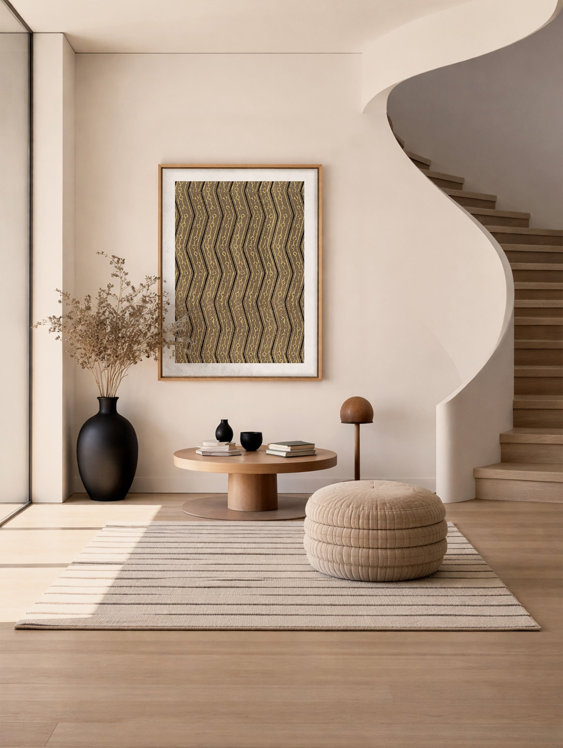 This art print showcases Octave, a refined jacquard design by Nobilis, featuring a theatrical rhythm of zigzag lines and delicate geometric detailing. Warm taupe and gold tones are contrasted with crisp black accents, giving the pattern depth, movement, and a quietly luxurious feel. The repeating composition brings together decorative elegance and graphic structure in a way that feels both vintage-inspired and modern. A striking statement poster that adds texture, warmth, and designer character to your wall decor.
