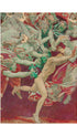 This art print shows symbolic figures around a central human form, telling a story of struggle and destiny. With deep reds, muted greens, and warm tones, it brings movement and drama to your wall. Perfect as a statement piece for any gallery-inspired interior.