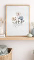 A minimalist poster featuring pressed flowers in blush, pale blue, and warm ivory on a clean white background. The subtle textures and simple taped detail give it a handcrafted, airy feel. Perfect for adding calm and natural elegance to bedrooms, living rooms, nurseries, or Scandinavian and minimalist interiors.