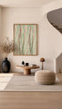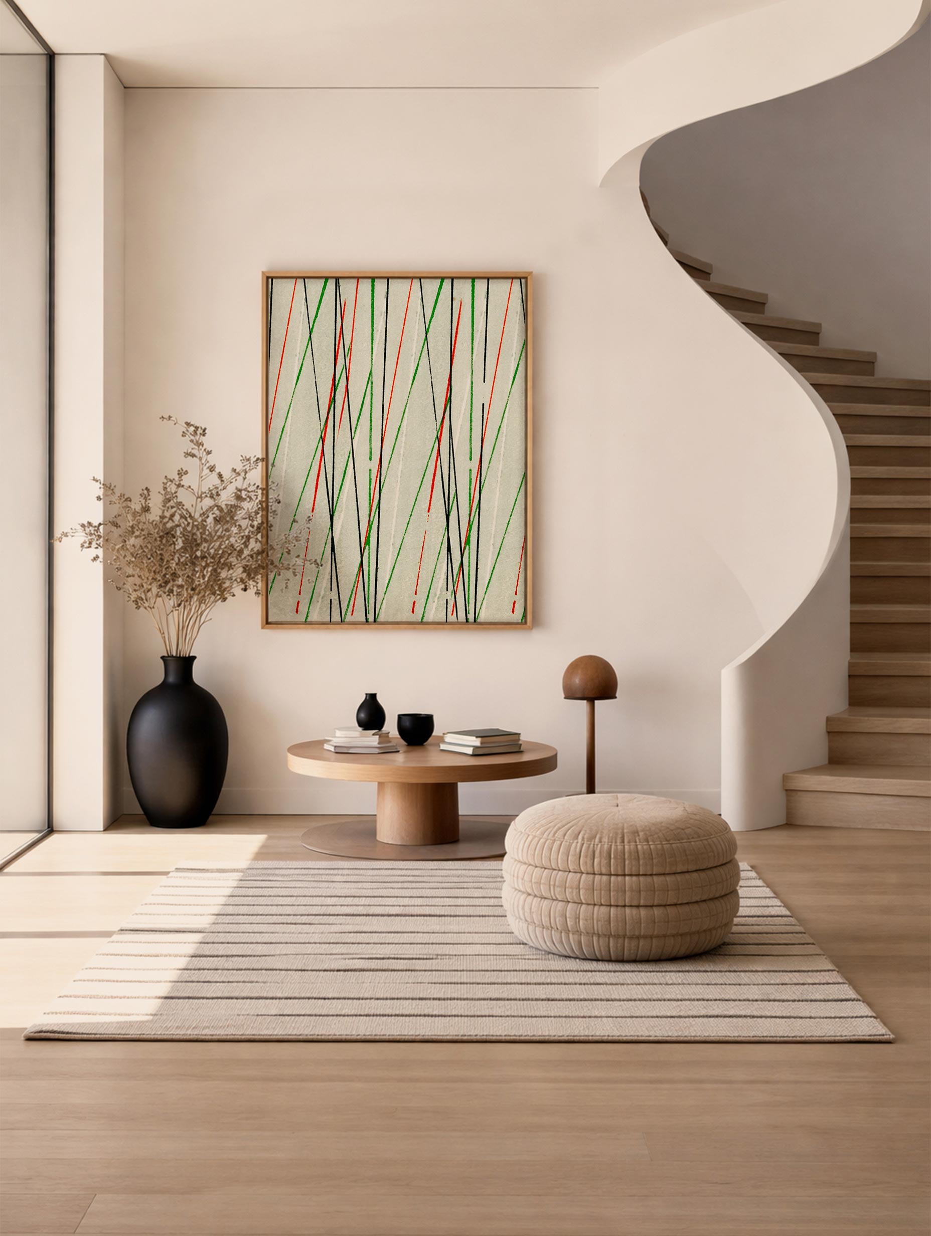 This art print features a striking Shima Shima pattern inspired by traditional Japanese woodblock design. Dynamic diagonal lines in red, green, and black cross over a soft neutral background, creating rhythm, movement, and visual balance. The repeating stripes feel both graphic and minimal, reflecting the timeless simplicity of Japanese pattern art. A bold yet refined poster that adds modern energy and artistic character to any wall decor.