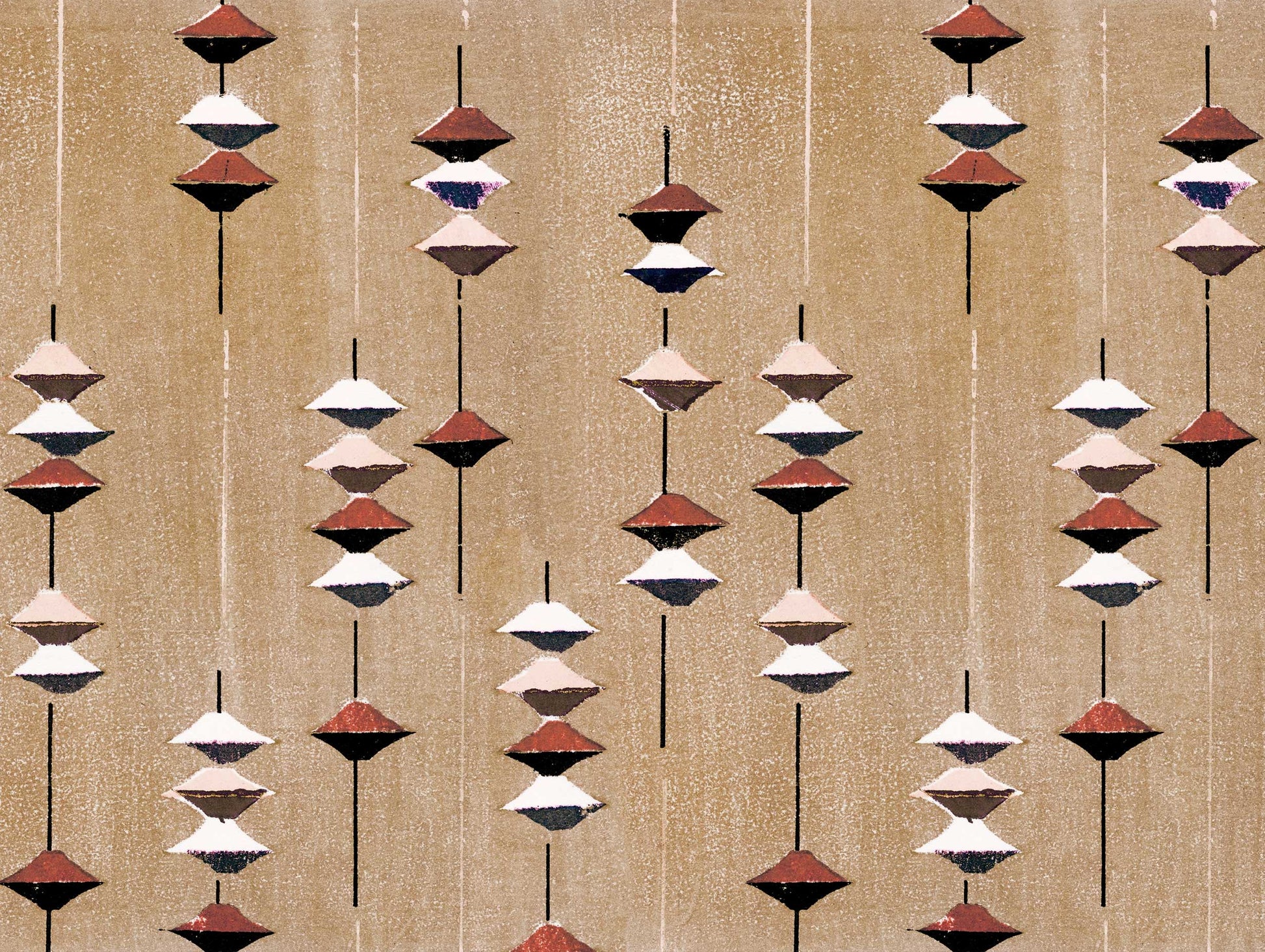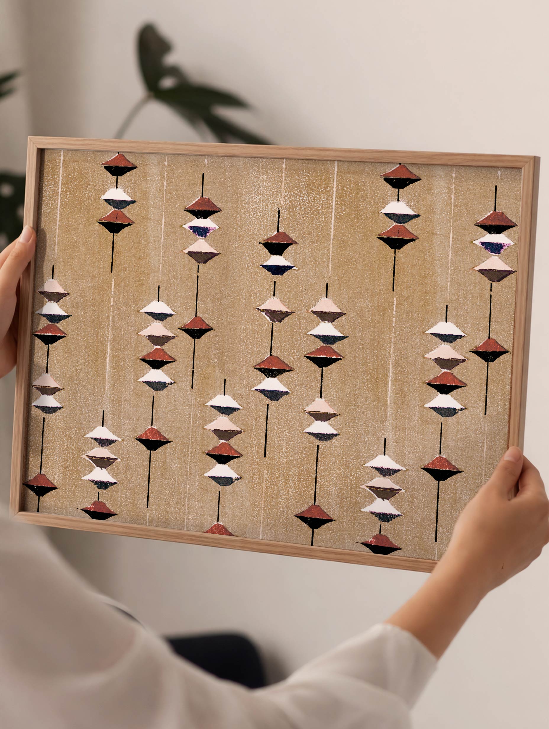 This art print reproduces Shima-Shima, a decorative textile design created by Japanese artist Furuya Korin in 1904. Suspended geometric forms repeat in vertical lines, blending warm terracotta, ivory, charcoal, and muted tones against a soft beige background. The balanced rhythm and stylized shapes reflect the elegance of early 20th-century Japanese design and traditional pattern art. A refined statement poster that adds warmth, graphic harmony, and timeless Japanese aesthetics to your wall decor.