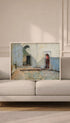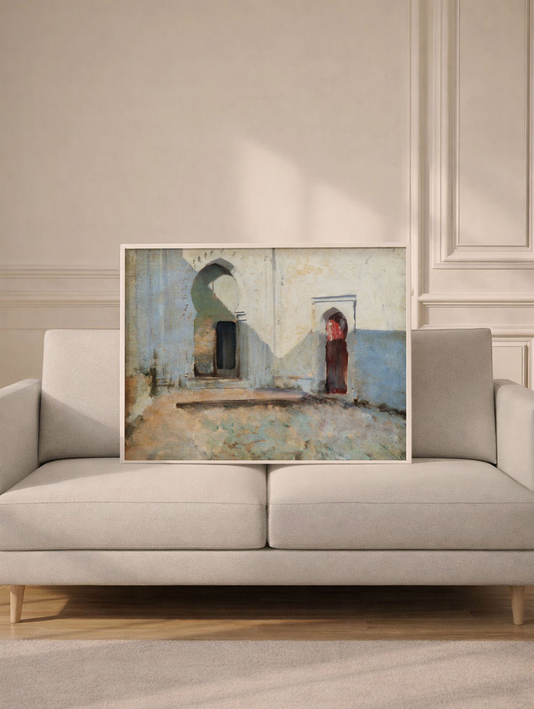 A luminous art print featuring a serene architectural passage bathed in gentle sunlight. With its textured white walls, deep shadowed doorway, and muted earthy tones, this piece captures the quiet beauty of Mediterranean-inspired spaces. The soft painterly finish and calm composition make it a timeless choice for minimalist, rustic, or warm gallery-style interiors.