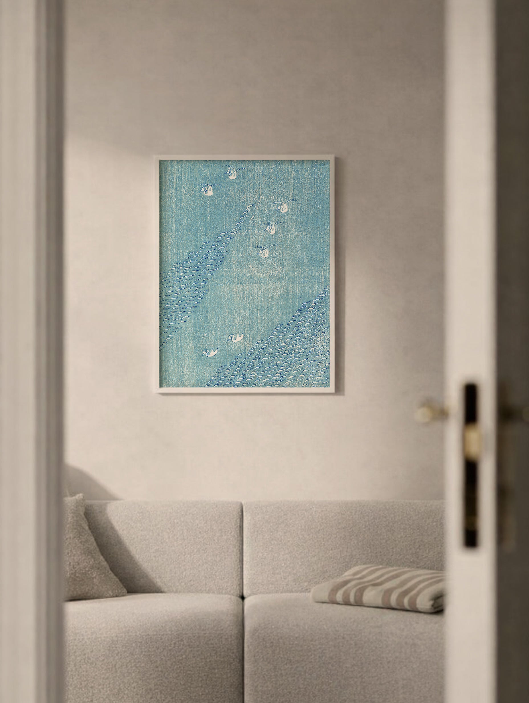 This art print reproduces Yatsuo no Tsubaki by Japanese artist Taguchi Tomoki. Soft blue textures form a calm sky where delicate white birds glide in gentle formation, creating a sense of rhythm and quiet movement. The subtle carved patterns and airy composition reflect the elegance of traditional Japanese woodblock printing. A serene and minimalist poster that brings peaceful motion and refined Japanese aesthetics to your wall decor.