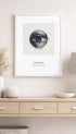 En fridfull abstrakt poster inspirerad av kustlinjen. Mjuka blå nyanser, havsglasgrönt, dimmigt grått och blek sand bildar ett mjukt rutmönster, med ett litet fönsterliknande motiv i mitten som ger en lugn, mänsklig touch. Perfekt för att skapa lugna kuststämningar i ditt utrymme.